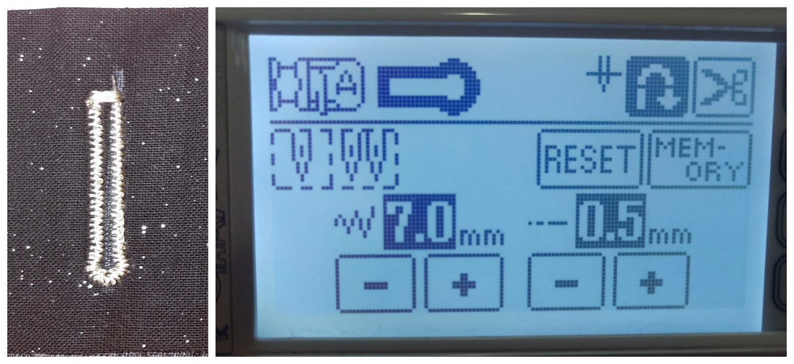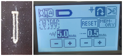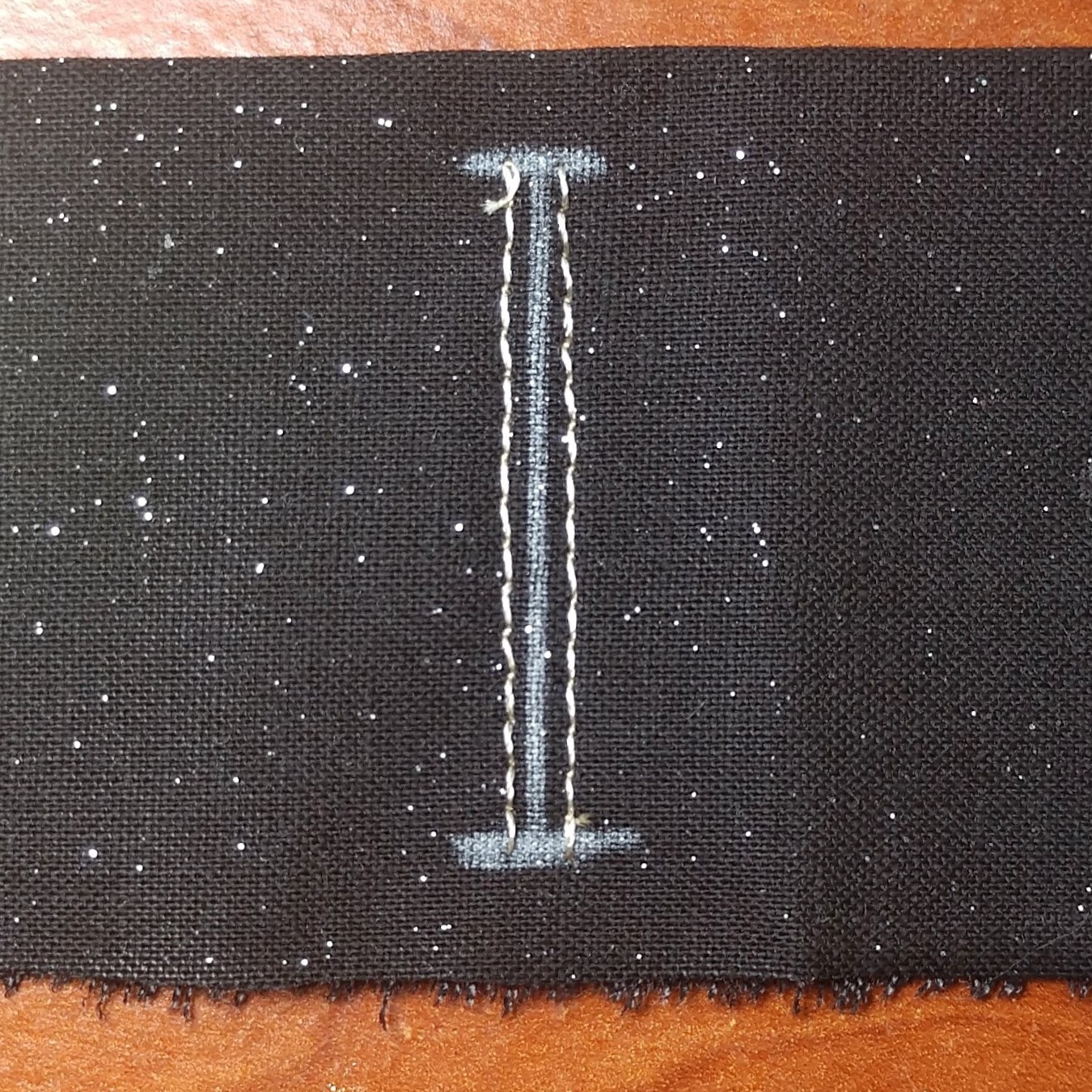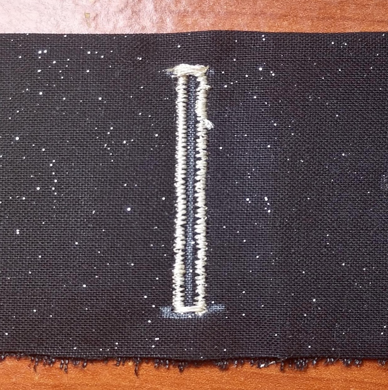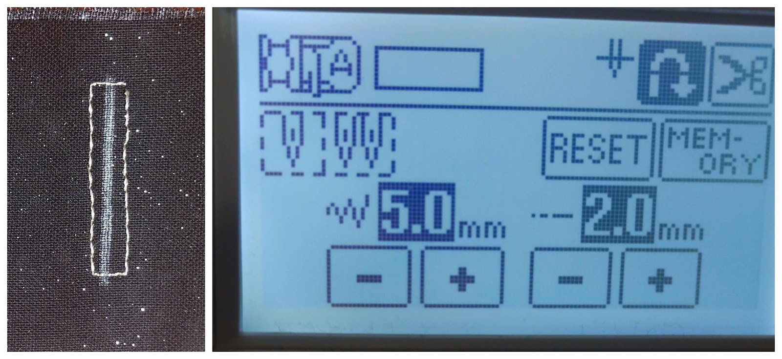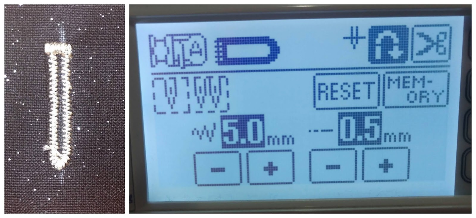 Now we are going to sew a bartack at the top and bottom, on the horizontal lines of the “I”. A bartack is a tight zigzag sewn just as a stable or secure point where there is lots of stress. You make a bartack by setting your zigzag stitch width at 5 mm and stitch length at 0mm.