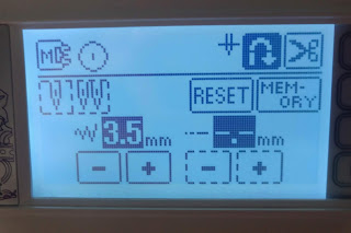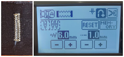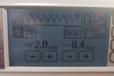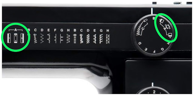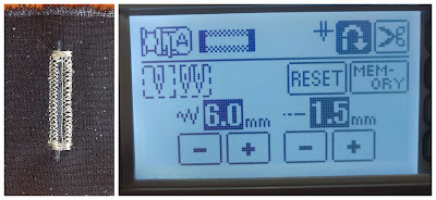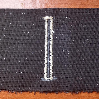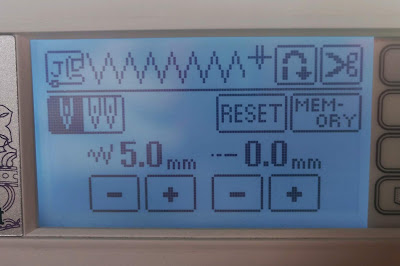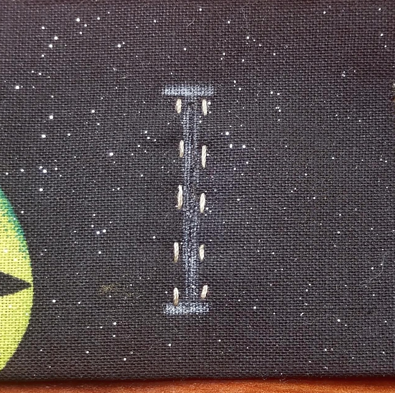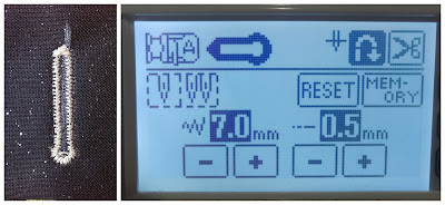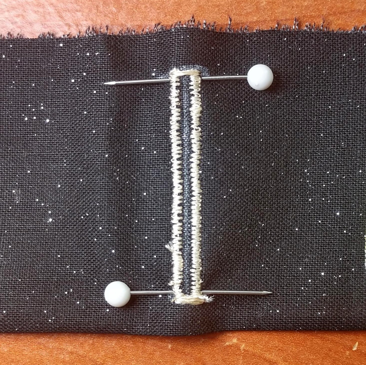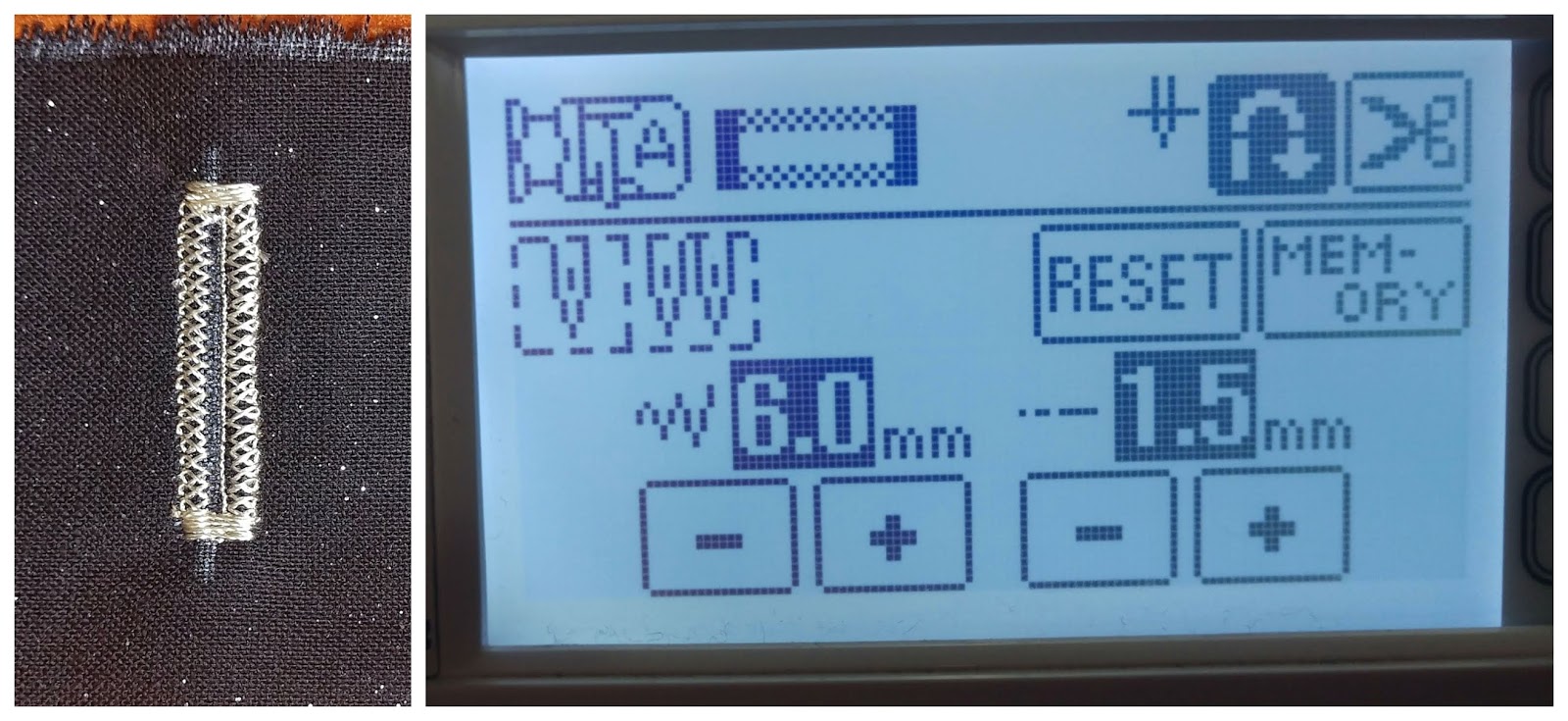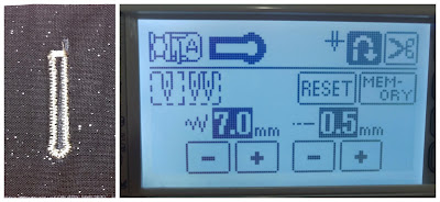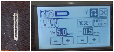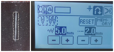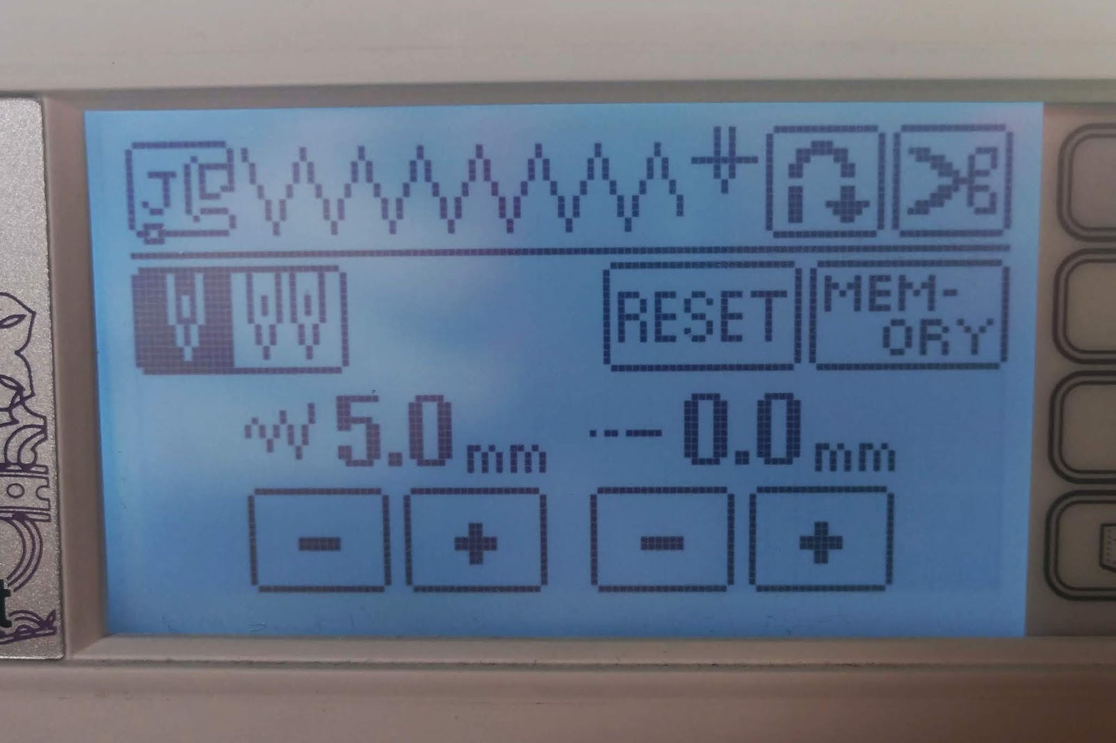Now we are going to sew a bartack at the top and bottom, on the horizontal lines of the “I”. A bartack is a tight zigzag sewn just as a stable or secure point where there is lots of stress. You make a bartack by setting your zigzag stitch width at 5 mm and stitch length at 0mm.