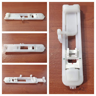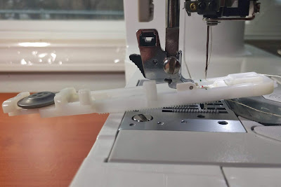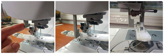 Press the release lever again and align the presser foot clamp with the little bar on the buttonhole foot and drop the presser foot lifter down until it latches onto the buttonhole foot.