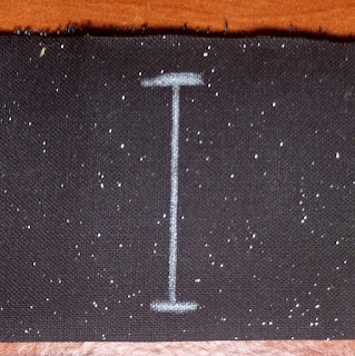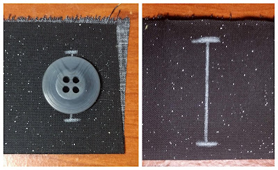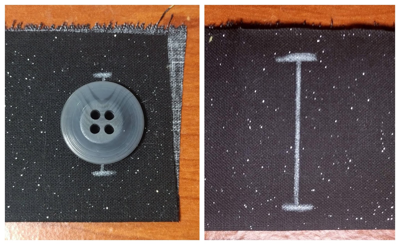 Here is a stabilized piece of fabric all ready to take on a buttonhole, notice the buttonhole placement mark. Select a button that fits within the mark with the tails of the “I” sticking out from either side of the button.