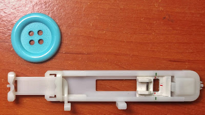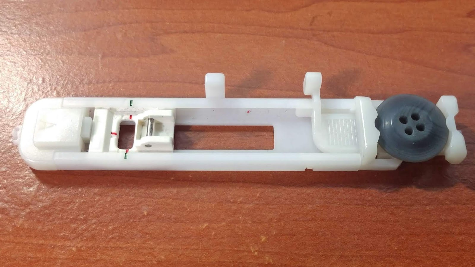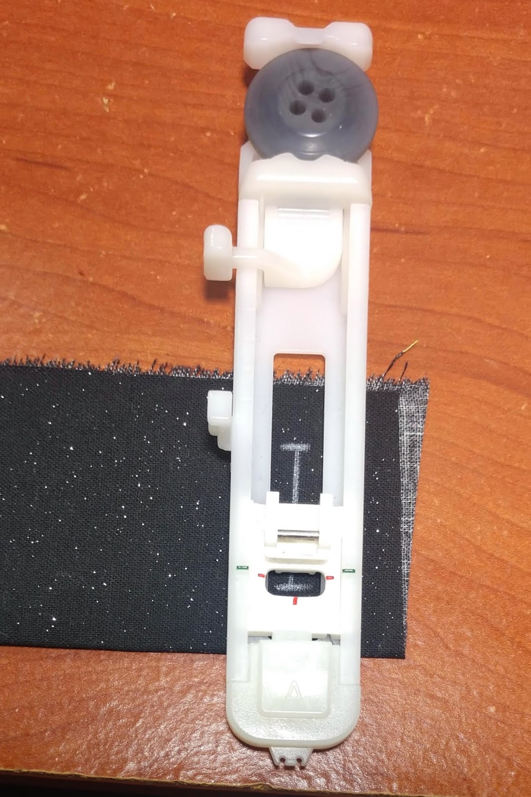 Place the button in the back section of the buttonhole foot and close it so that the button is snug. This is how long the buttonhole foot tells the machine to make the buttonhole.