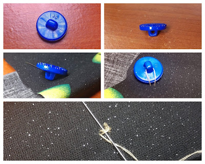 First, let’s sew a shank button because you can’t machine sew a shank at all. You are going to line up your shank with the X button placement mark and starting from the bottom of the fabric go up and through the shank and then back into the button, near the place where the needle came up. Repeat 3 times, unless you’re paranoid like me, then you might repeat 6 times, but I don’t think that actually makes it better. Then with the needle on the bottom, you are going to under and around the stitching 3 times. Then tie a knot and you’re done!