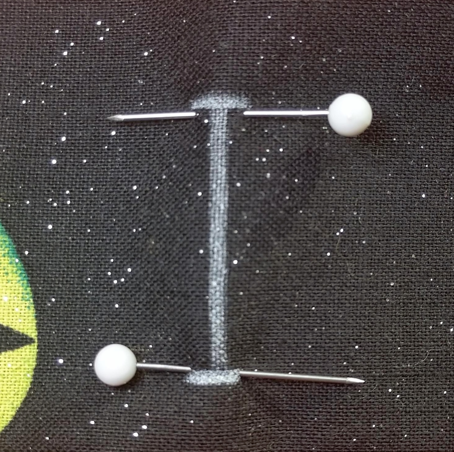 I have one last kind of buttonhole that can be sewn on a machine. It’s used in those times when your machine just doesn’t feel like sewing a buttonhole. Or for machines that don’t have buttonhole capabilities. Or when this happens:That button is NOT going to fit in that buttonhole foot. There is absolutely no way! But we aren’t going to give up hope. We now know how a buttonhole should look, so let’s just make one using the principles we’ve already learned. First step, make the fabric, whether you decide to adjust the spacing of your buttons is up to you. But you’ll need to mark your pattern so that the horizontal lines of the I shape can be seen on the outside of the button lip, or you can take your button size and add ¼ inch. I personally think just marking the outside of the button is easier.