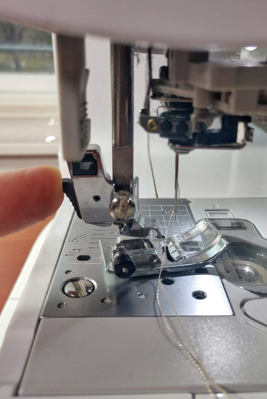 The first thing I’m going to do is put the button stitch foot on my machine and then drop my feed dogs with this switch on the back of my machine. Please check your manual for the exact way to do this.