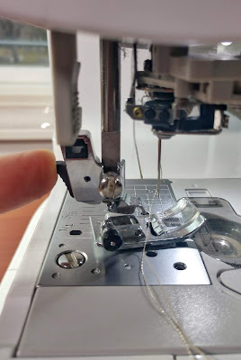 So, here we are, the fabric is marked and interfaced, the buttonhole foot is in place and we are brave enough to get started! Slide your fabric under the buttonhole foot and hold the thread to the side and out of the way.