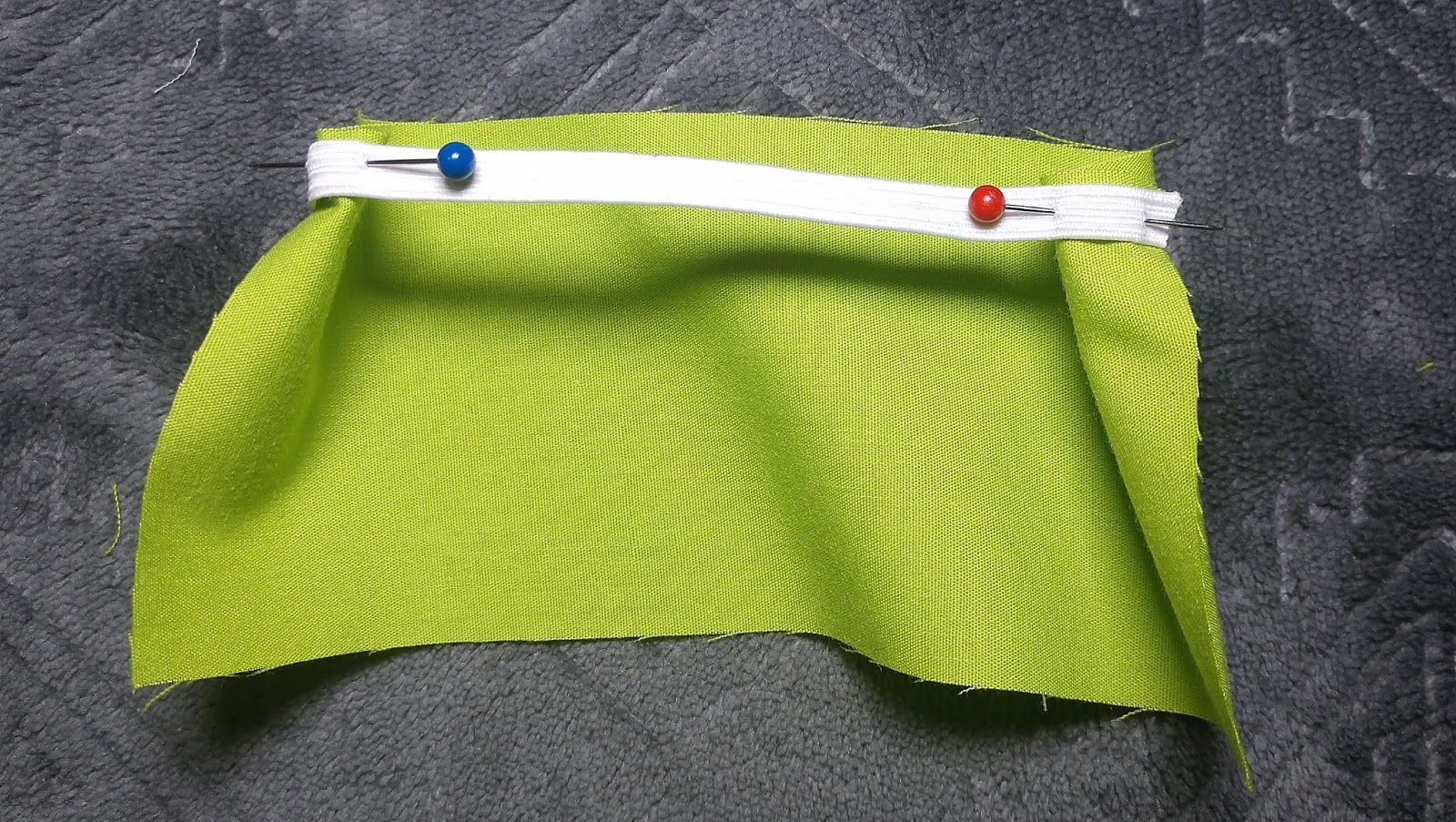 So, back to using 4 inches of elastic on 8 inches of fabric to create a 4 inch ruffled piece. First thing I want to say is cut the elastic an inch longer! Having the extra inch gives something to pull on from behind the machine, making it a lot easier to start stitching! Mark your elastic at 1 inch and pin it to the wrong side of the fabric. Then pin the other raw edge of the elastic to the edge of the wrong side of the fabric. In this case, stretching the elastic evenly is going to be simple because it’s so short! But if the ruffle is going to be a long one, it might be helpful to mark the elastic and fabric at matching points along the way. The center and at quarter points (just like a waistband or neckband) is perfect! If you want to mark more than quarter points, feel free to be as precise as desired!