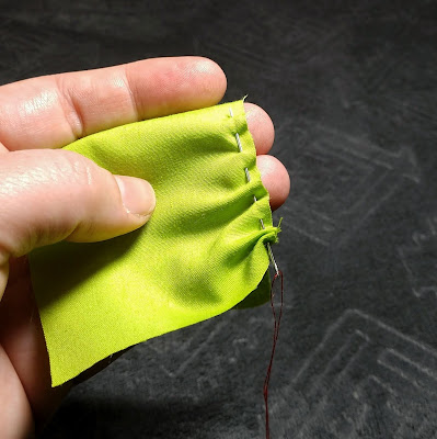 And now we have the three row method. This shouldn’t be too hard to understand by now as the concept it similar to all the others. Long tails at the start and the end, no back stitching, and stitch ⅛ to ¼ inch apart. But let’s take a look at how you actually gather these stitches!