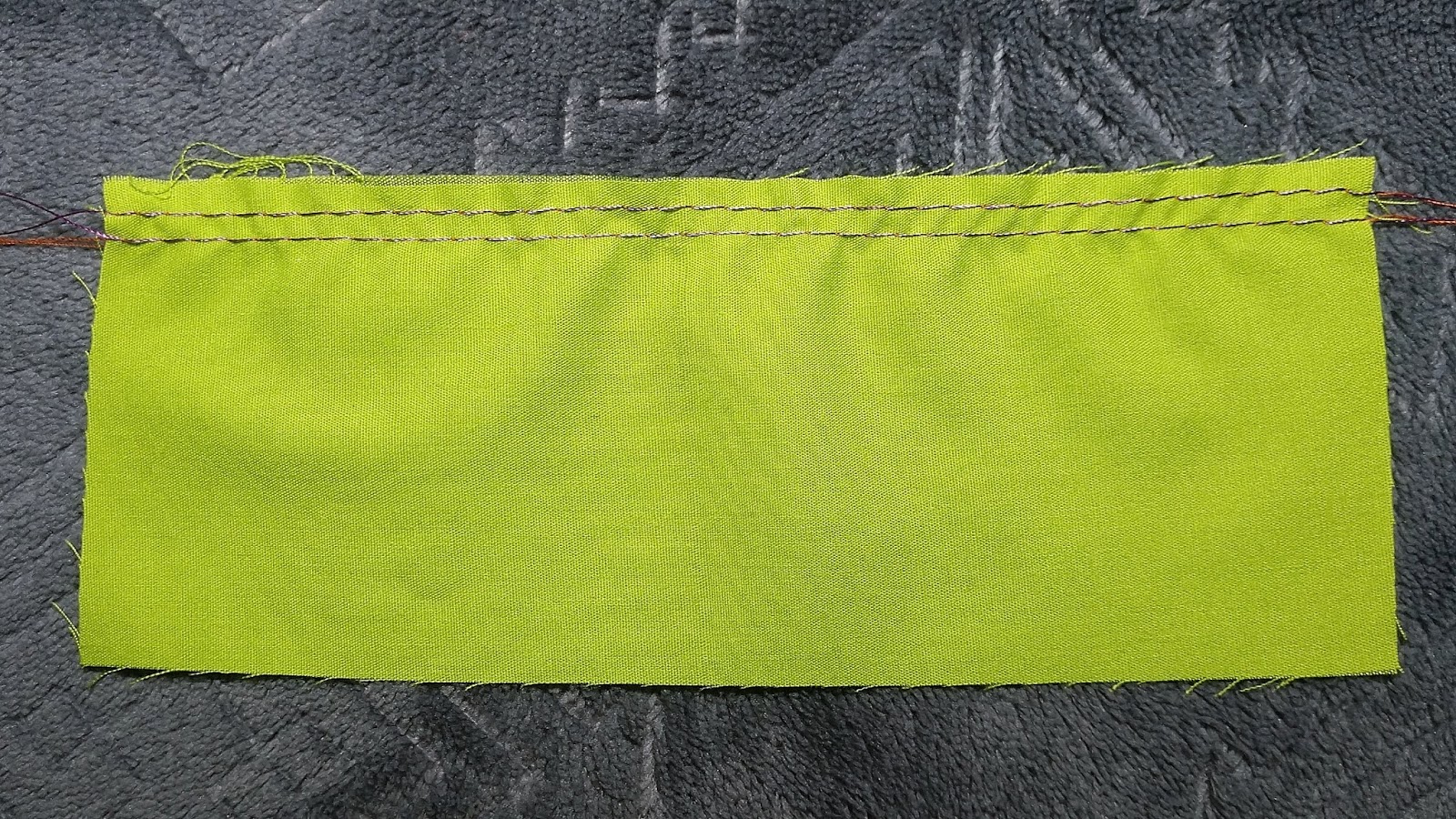 Quickly, I want to show you another way to have 2 rows of stitching work for gathering. Start by getting the tails ready and make a long straight row down the edge of the fabric go almost to the very end, but not off the fabric. Stop with the needle down and raise the presser foot. Turn the fabric 90 degrees and drop the presser foot back down. Now make one single stitch. Leaving the needle down again and raise the presser foot. Turn the fabric 90 degrees so the stitching will go back the way it came. And stitch back along the first row of stitches being very careful not to go too near. Now, this technique isn’t going to work well on long pieces or pieces that need to be gathered a lot, or on pieces that are hard to gather because if a thread snaps the whole process has to be unpicked and started from scratch.
