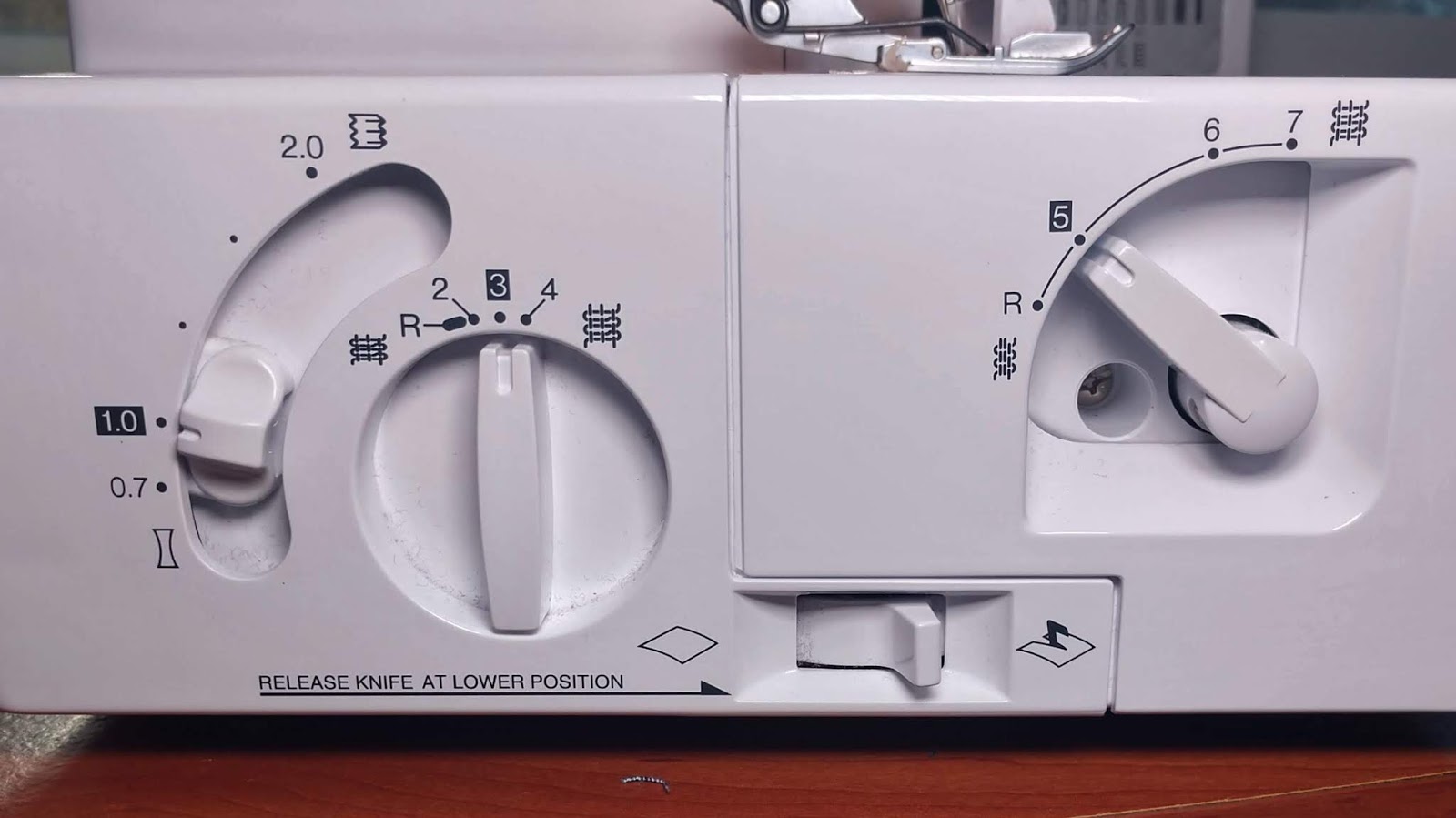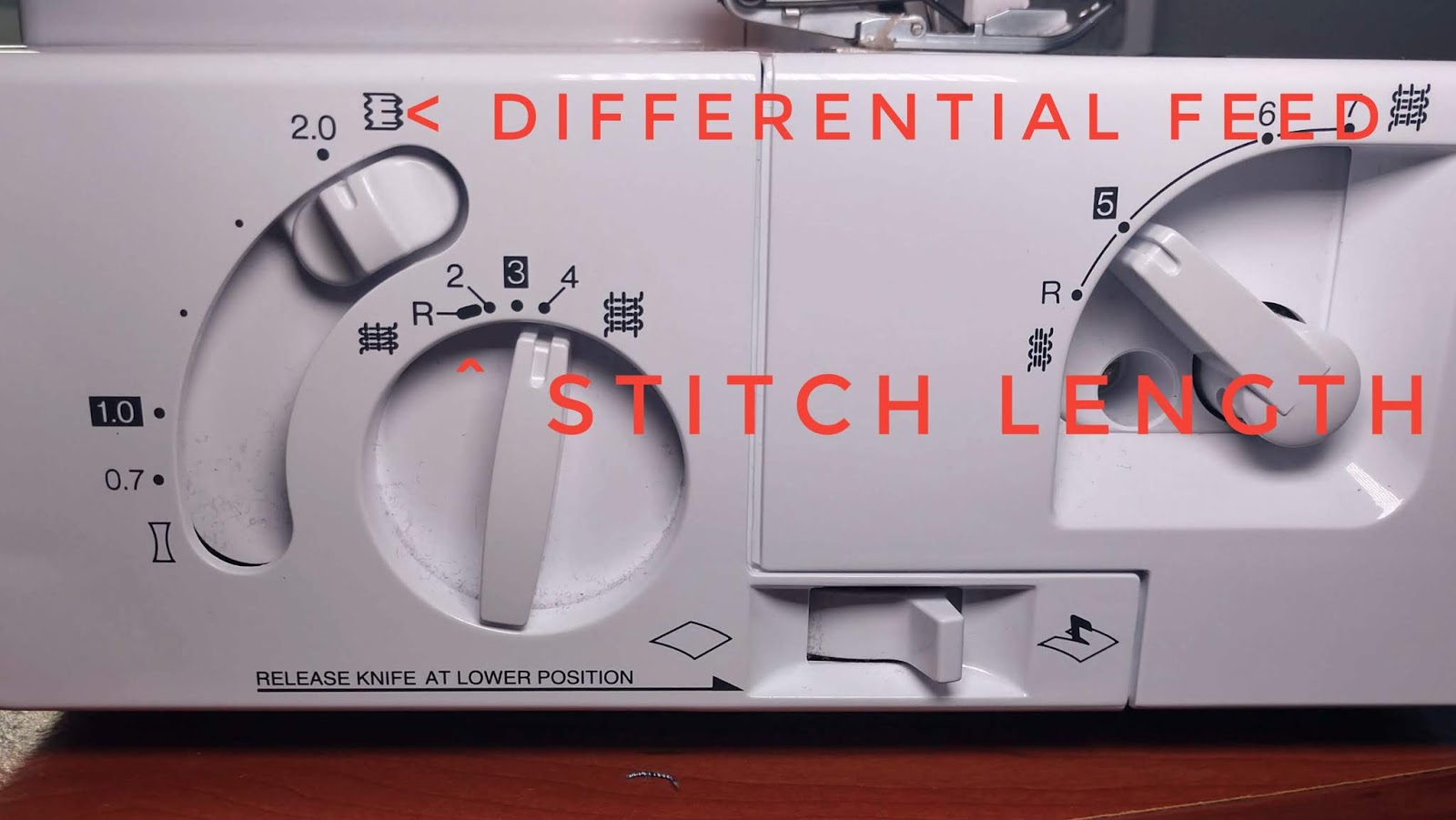 Next, have you heard the rumor of being able to ruffle with the serger? Terrified of changing the setting on said serger in order to try it out? I hear ya! I totally understand where that fear comes from. But I’m also here to say that it’s not nearly as bad as all that! We aren’t even going to touch the tension!! I know how hard it is to get those back to perfect, believe me I know!! I have a Brother 1034D. I am going to turn my machine to the side and where there dials. These dials are going to give us the ability to ruffle fabric. These are my current settings.