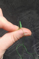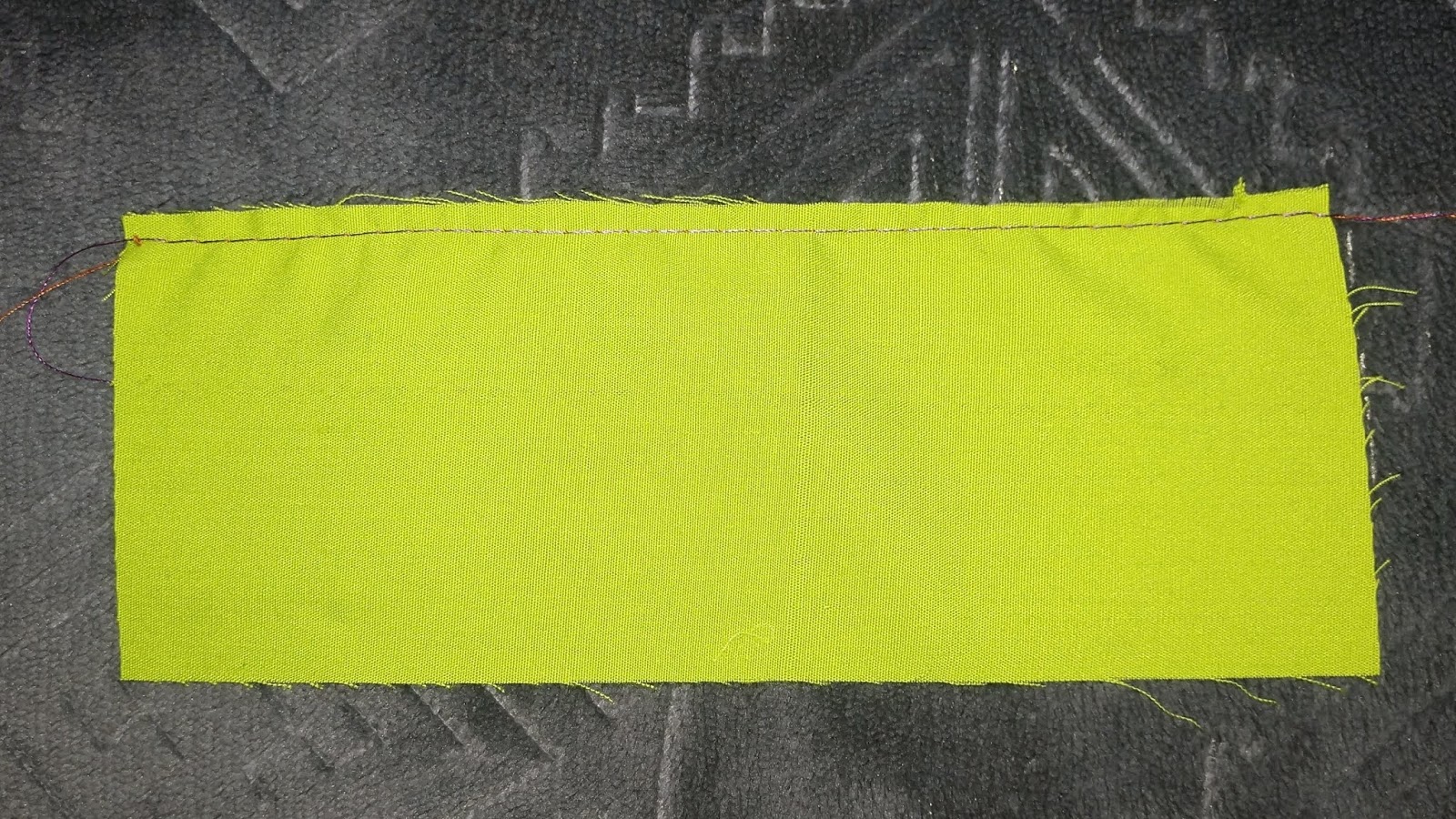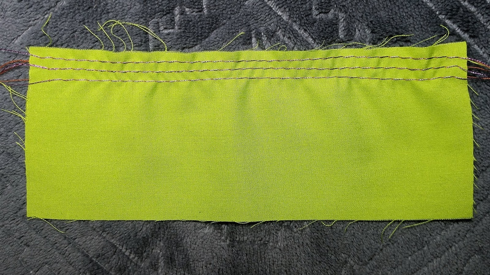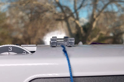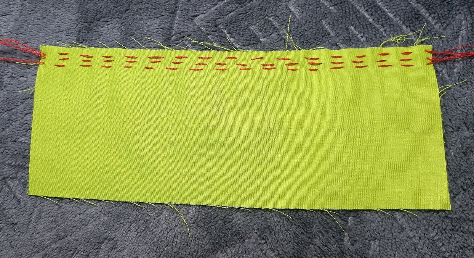 So, here’s how it works, set the sewing machine stitch to do a wide zigzag. As wide as possibly. My machine will go clear up to 7mm wide, that’s a lot! Then set the stitch length to be about mid length, or normal or 2.5mm in my case. Take the knot on the floss and put it under the presser foot, behind the fabric, and hold it, just like the tails are held. Now stitch the wide zigzag all the way down the length of the fabric with the floss down the middle under the zigzag.
