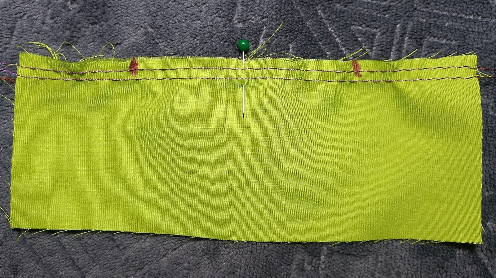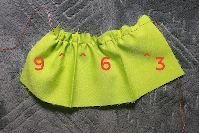 For really long pieces of gathering, you may even want to mark the center of the fabric and sew each line to the center and have two places for each thread to be gathered to.
