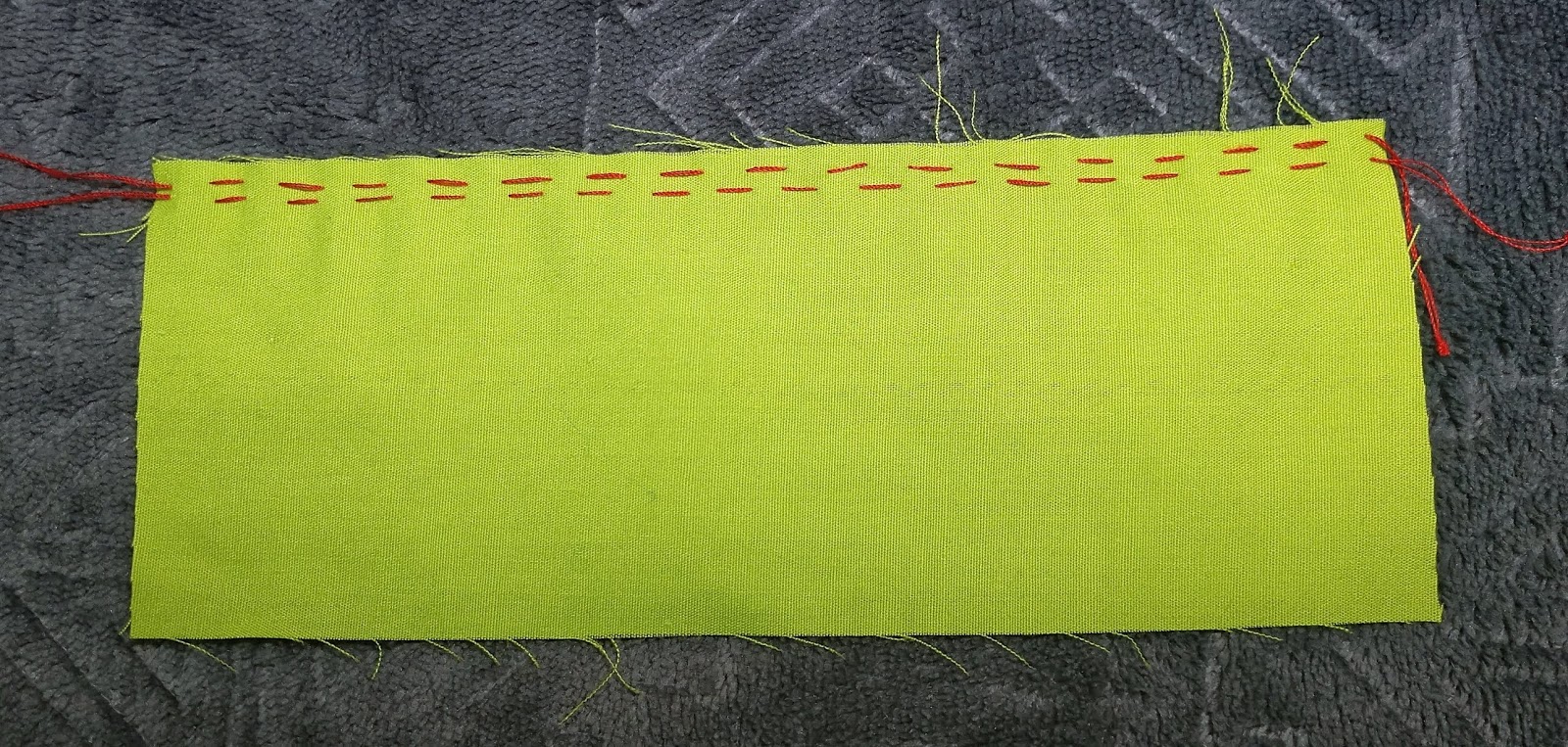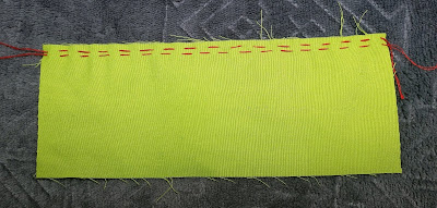 Gathering fabric by hand is really pretty simple. It takes a needle, some thread and lots of time and patience. The best practice for this is to use a needle appropriate to your fabric and thread that will match (mine doesn’t match very well because I wanted it to stand out in the pictures, but I probably could have done better with that, sorry) cut the thread to be at least double the length of the fabric, if the pieces to be gathered is HUGE, you can safely make this thread triple the length of the finished ruffle and there will be plenty.