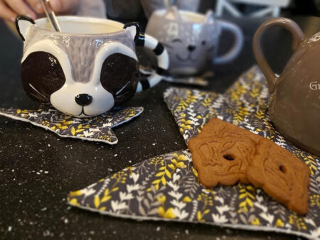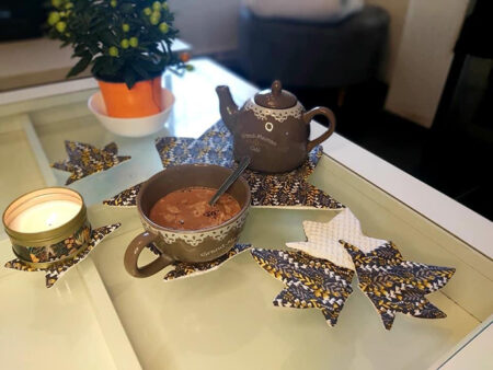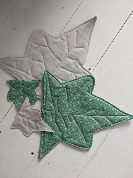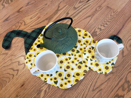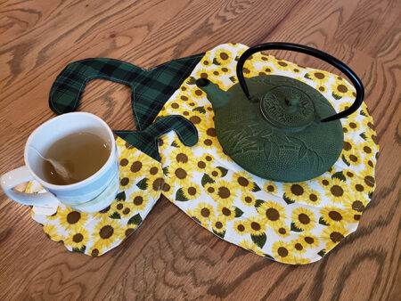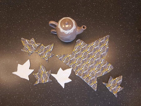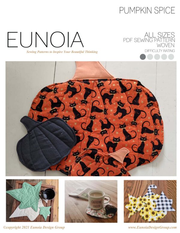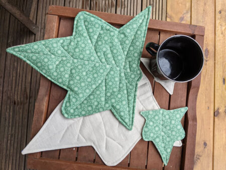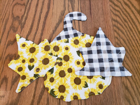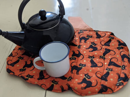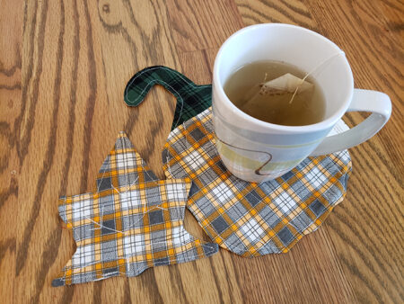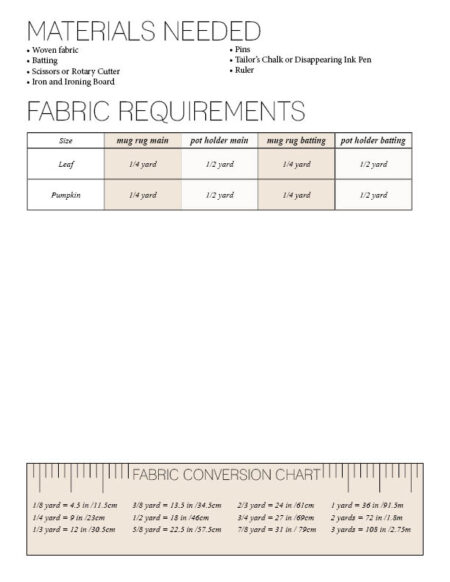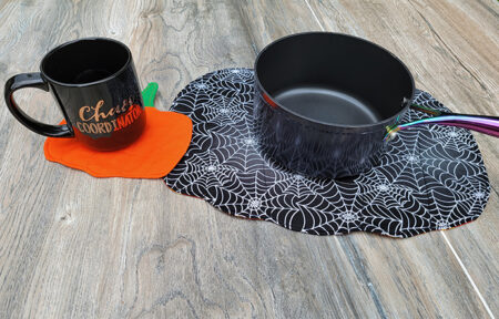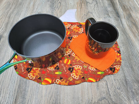 September is upon us and it’s time for warm drinks and great pots of soup, at least here in the northern hemisphere. What cuter way to dress up your table than with our cute mug rug and matching pot holder? With two different pumpkins and a leaf shape, you’ll be able to make all the things for your table!