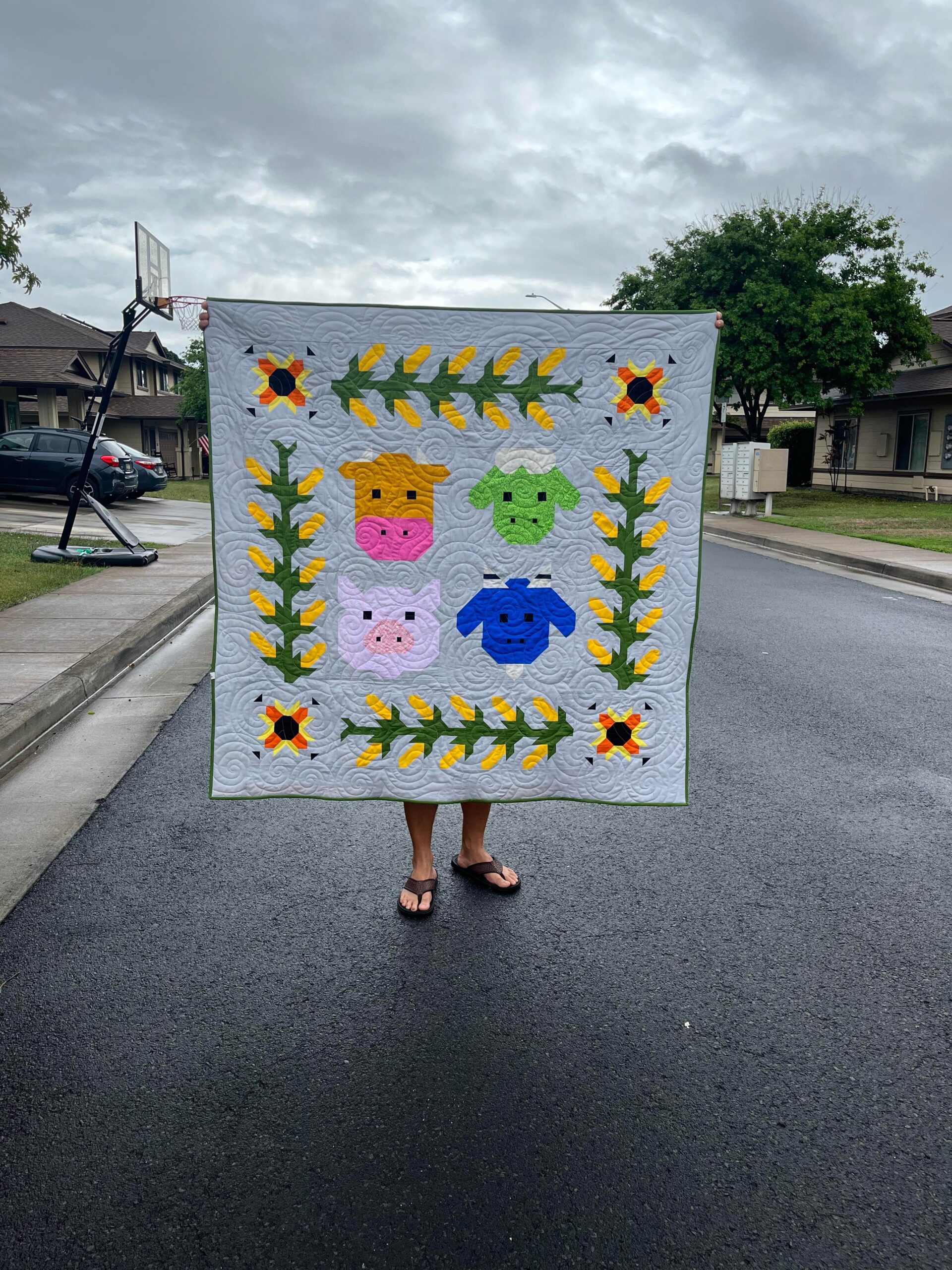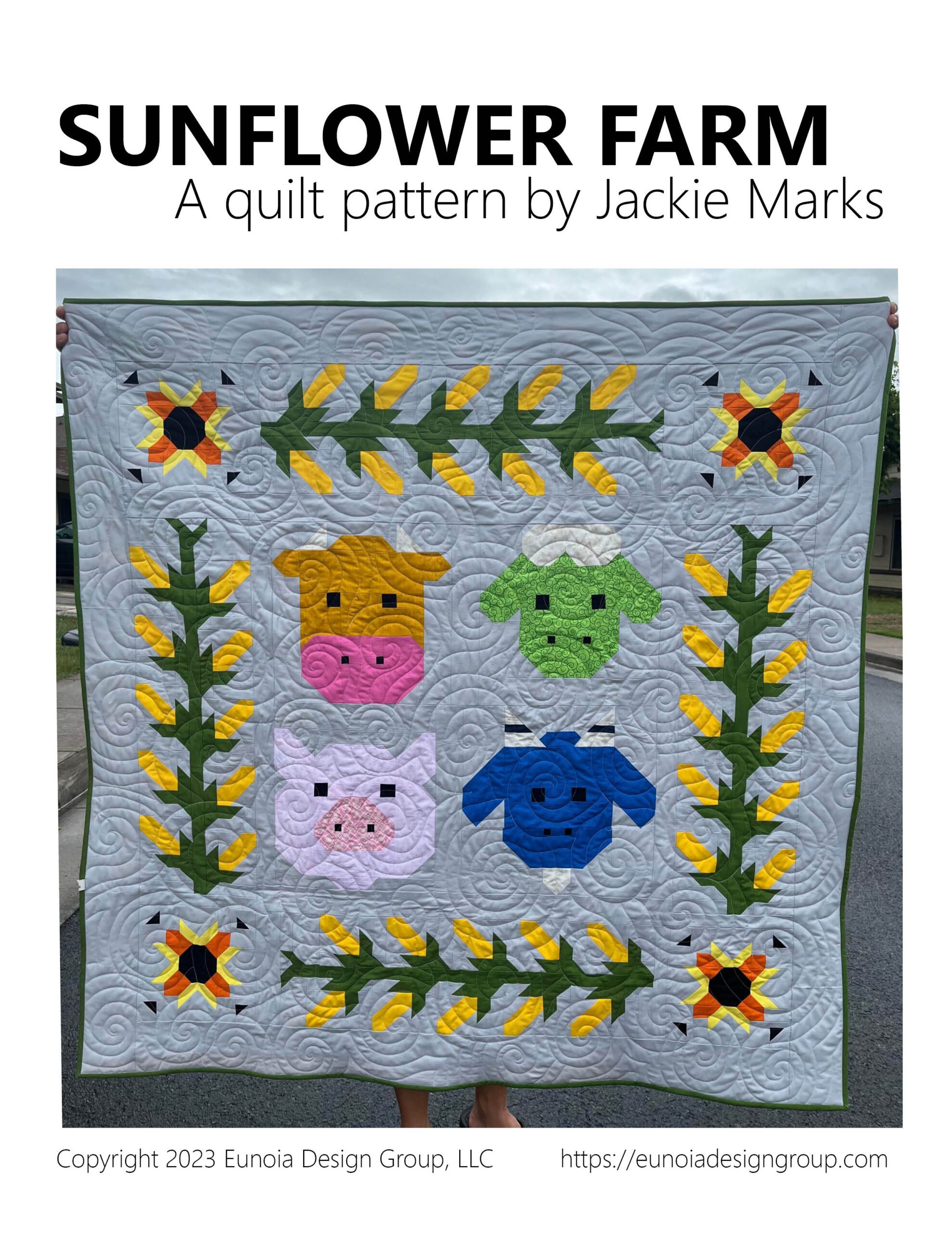 Our brand new Sunflower Farms Quilt is a cute Farmcore Quilt, reminiscent of sunny days eating fresh corn on the farm! The animal blocks are perfect to have in your repertoire of patterns for a variety of projects. The quilt features four animal blocks; A Cow, A Pig, A Goat and a Sheep. It also features a sunflower block along with corn blocks which together form 4 rows of corn. This pattern is for the quilt top only and has a finished size of 57″ x 57″.